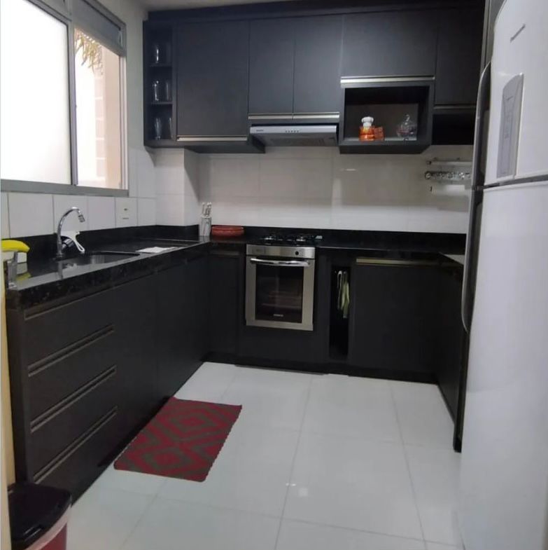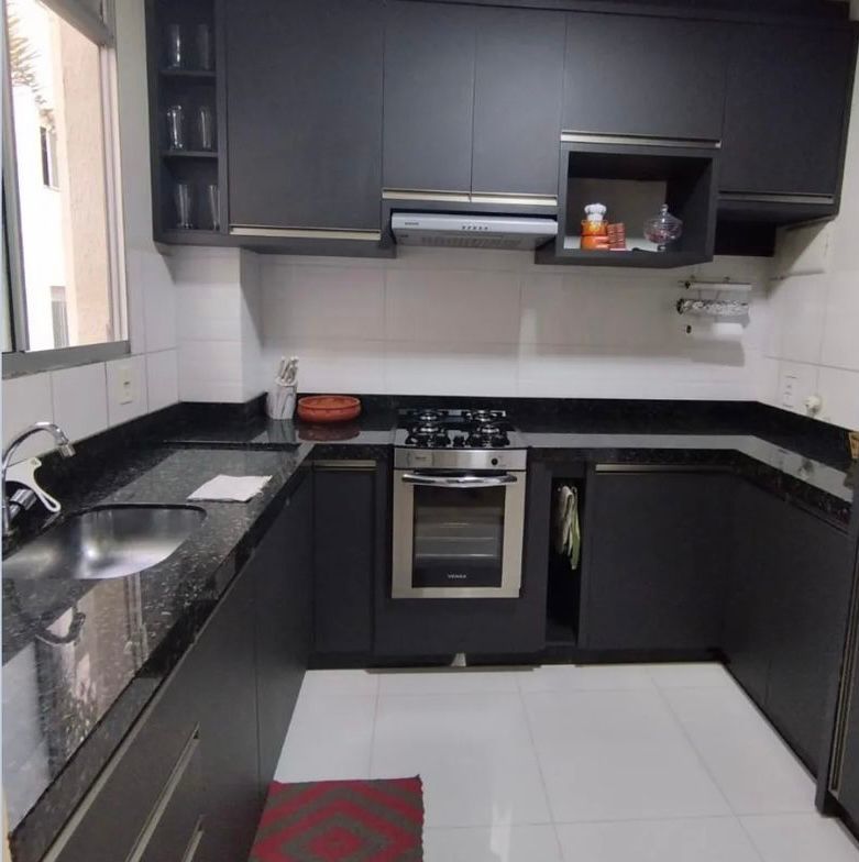 Móveis planejados na cozinha e no quarto de solteiro.